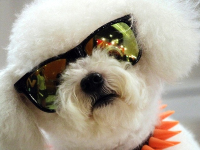Esse cão entende que, ao passear na orla da praia, deve-se tomar alguns cuidados especiais. Passar protetor solar e usar óculos escuros para proteger os olhos são alguns deles!