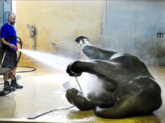 A elefanta acima está aliviada após ter tomado um clássico banho de mangueira. Feliz, ela até se deitou no chão para poder aproveitar até a última gotinha de água...