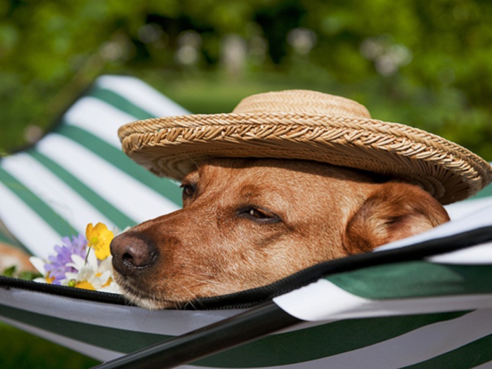 Hum, que preguiça... Após se esbaldar no clube, o cãozinho acima decidiu relaxar em uma rede e tirar uma soneca coberto por um chapéu.